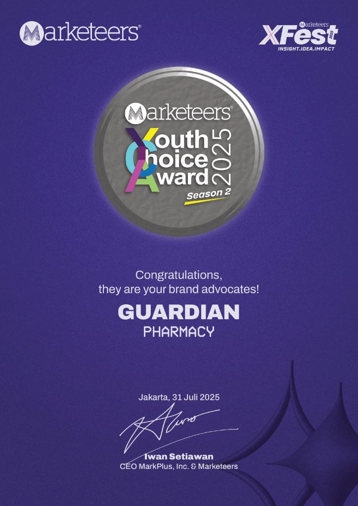 Guardian Indonesia has won the Silver Award in the Pharmacy Choice of Gen Z category at the 2025 Marketeers Youth Choice Awards. This accolade reinforces Guardian Indonesia’s position as the preferred pharmacy for Gen Z in Indonesia, reflecting our unwavering dedication to creating a positive, inclusive, and future-focused shopping ecosystem tailored to the unique needs of younger consumers. It serves as a testament to our commitment to innovation and delivering high-quality products and experiences that align with the aspirations of Indonesia’s youth.
